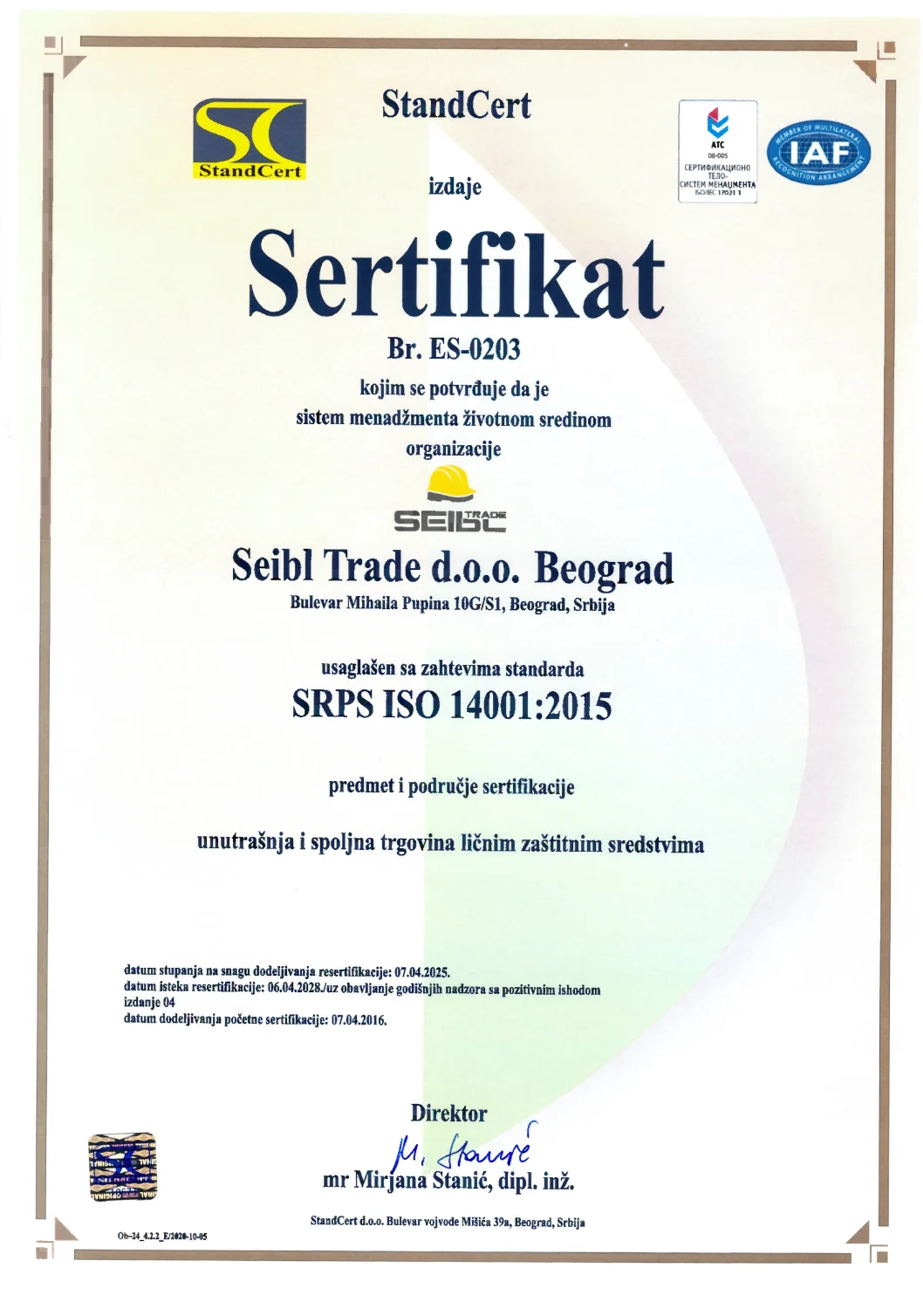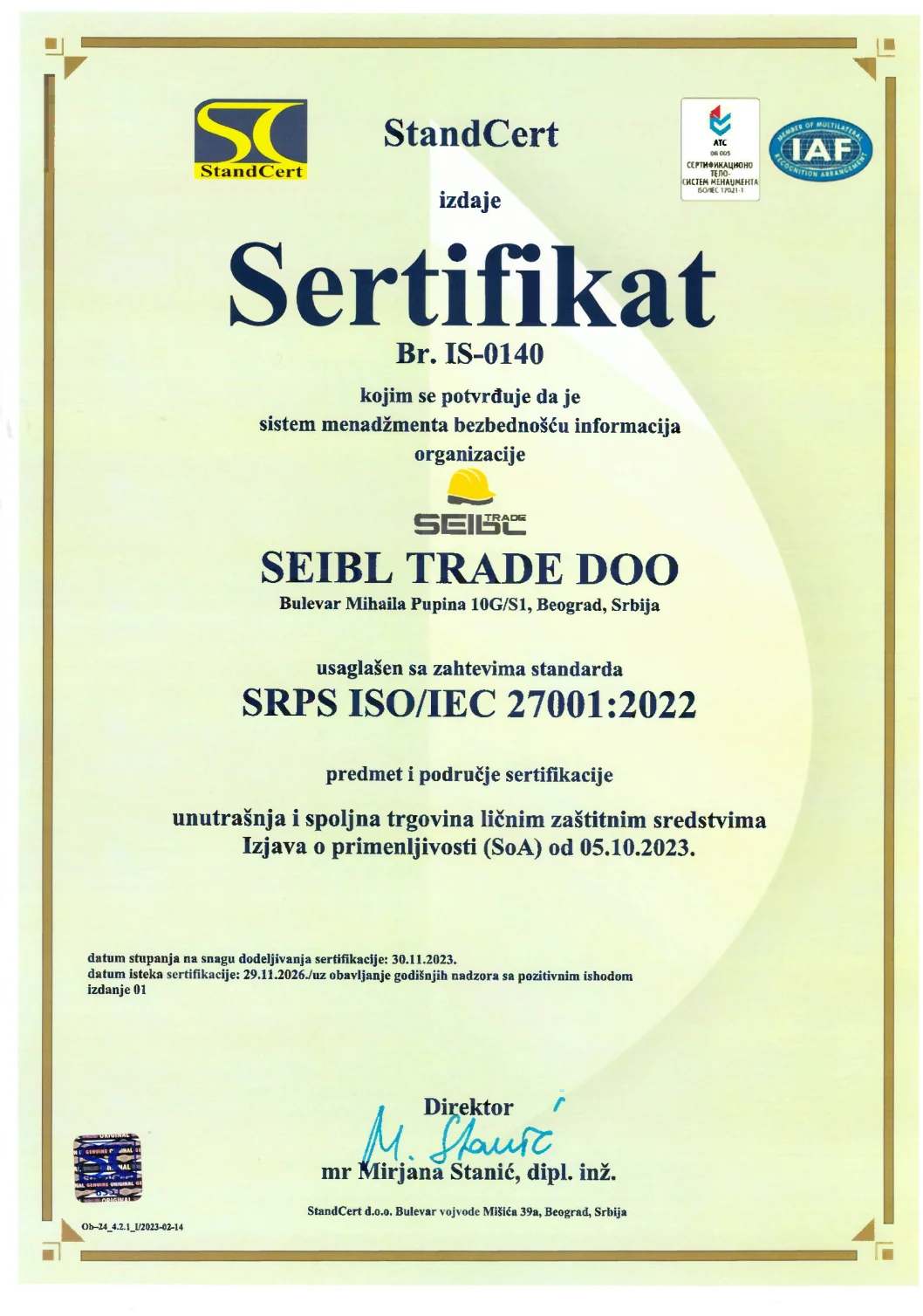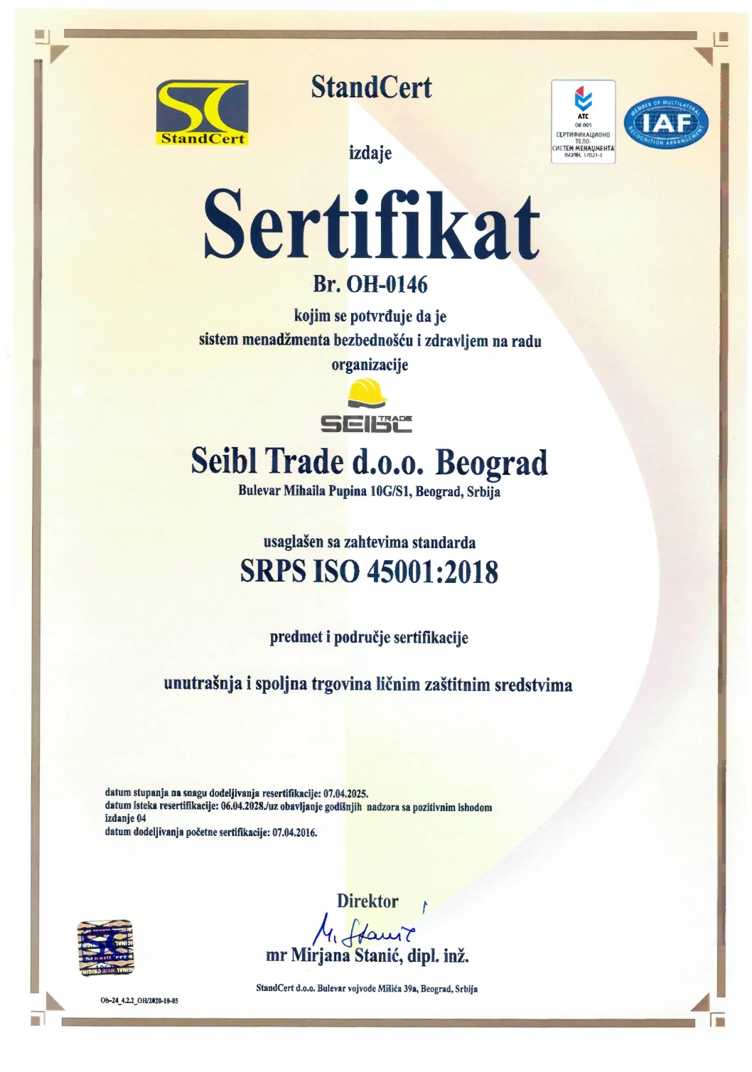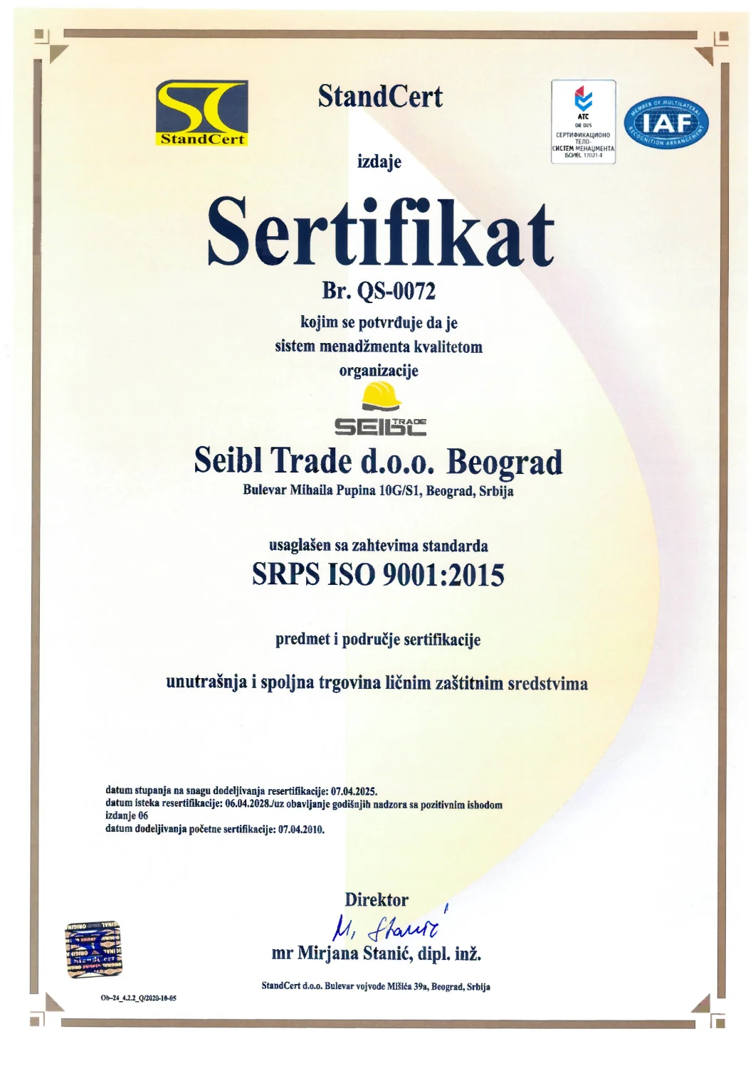 Kroz korektno poslovanje, tačnost i primenu standarda kvaliteta, besprekornu uslugu zaposlenih, podršku, sigurnost, konsalting i poverenje u odabiru kvalitetnih ličnih zaštitnih sredstava, kompanija Seibl Trade garantuje da će efikasno i uspešno delovati i ubuduće.