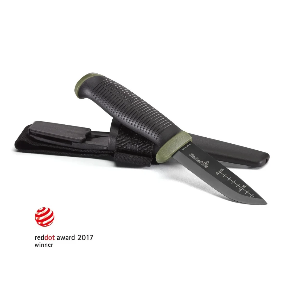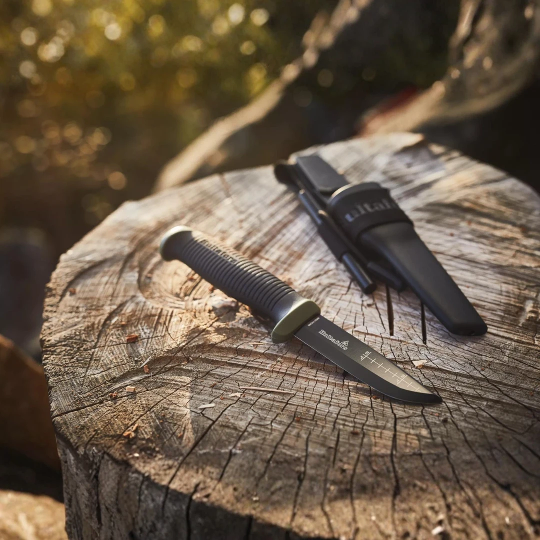 - Kičma oštrice, dizajnirana za paljenje vatre pomoću fire steel-a i metar izgraviran na sečivu čine ovaj nož prikladnim za korišćenje na terenu, u prirodi.