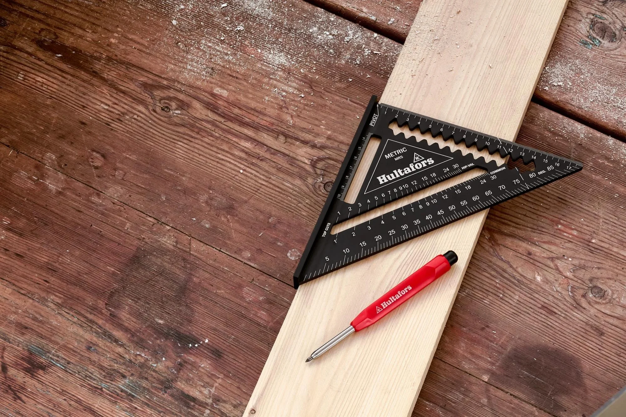 Rafter Square (tesarski trougli lenjir) je čvrst i višenamenski alat namenjen svim zanatlijama. Ima telo od čvrstog aluminijuma sa ivicama obrađenim CNC mašinama, što omogućava veću preciznost i dugotrajnost. Alat omogućava brzo i precizno označavanje uglova od 45° i 90°.
